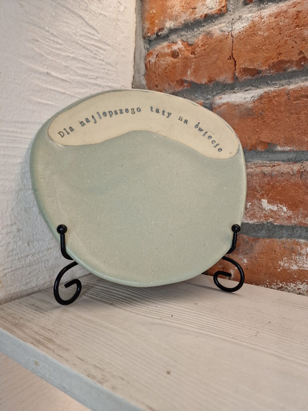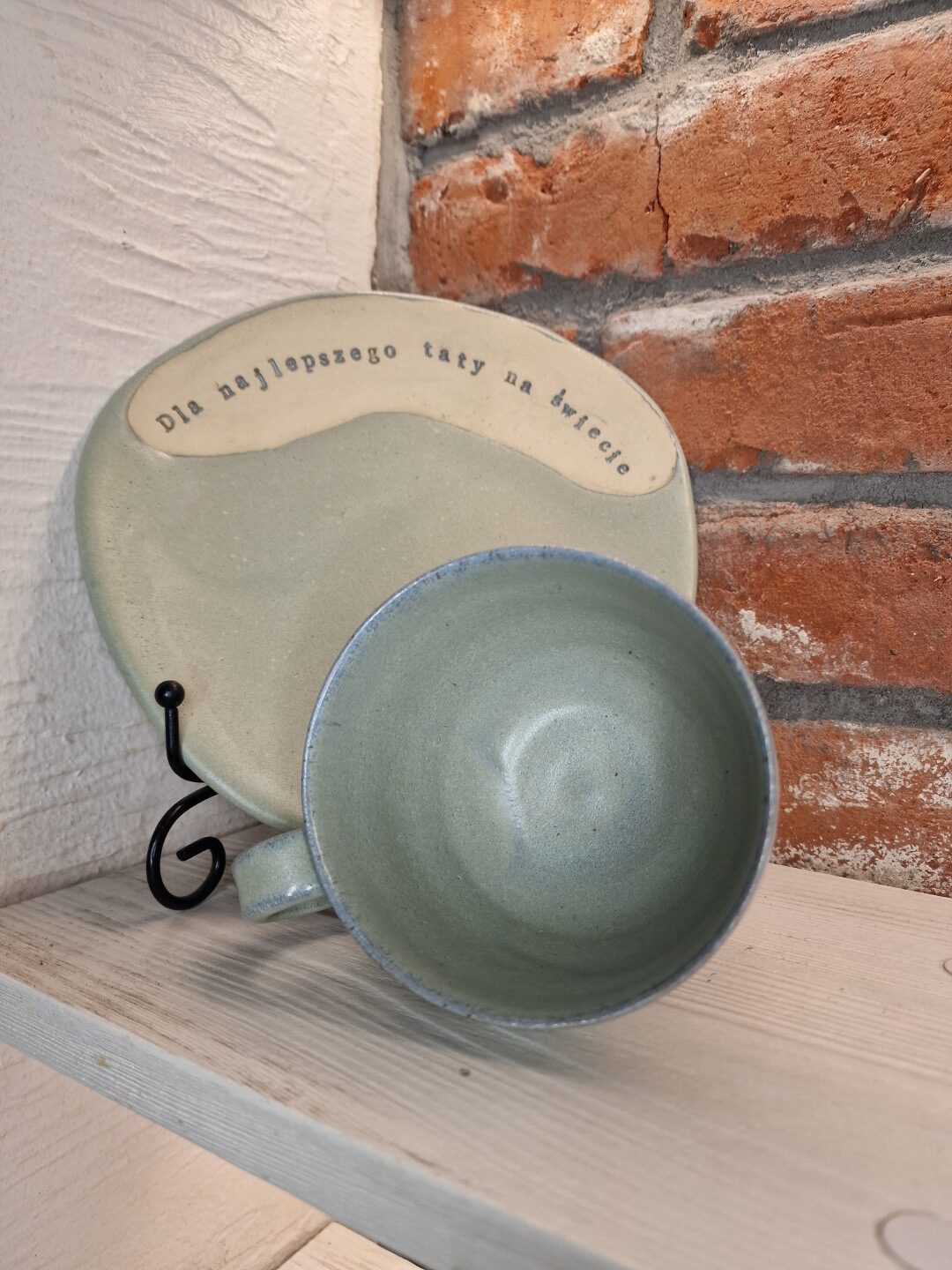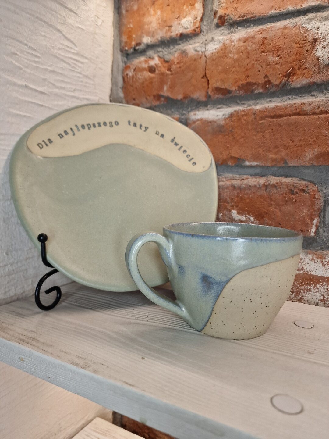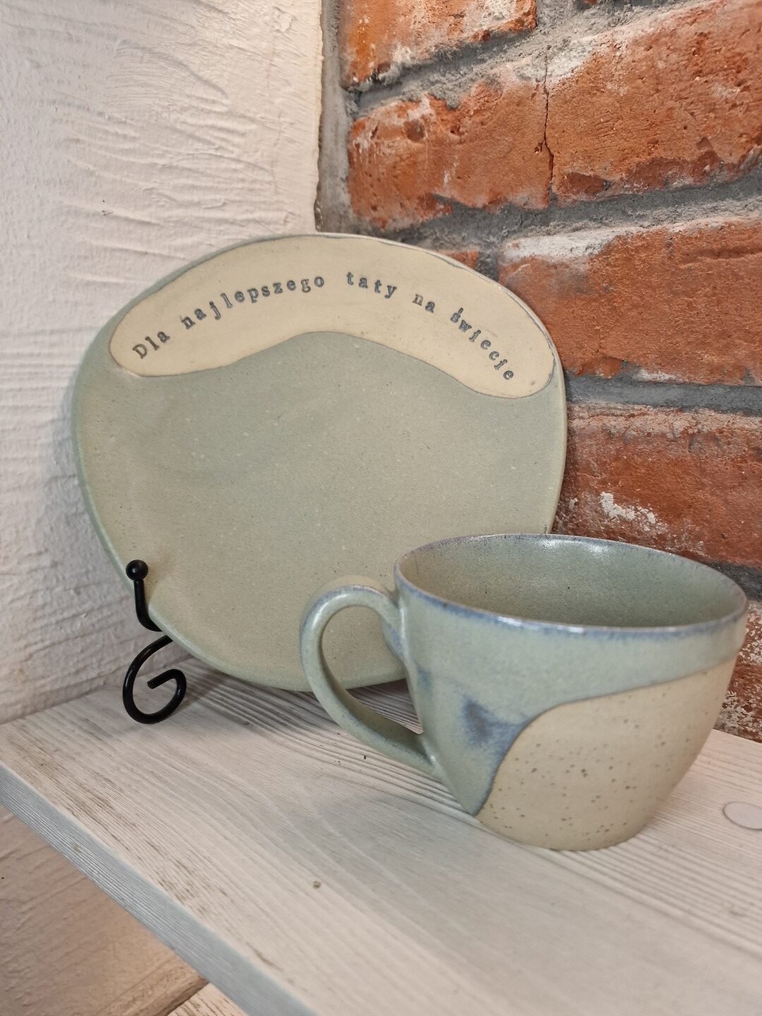 Filiżanka wykonana z nakrapianej gliny częściowo pokryta szkliwem. Talerz o nietypowym kształcie z sentencją: „Dla najlepszego taty na świecie” w błękitnym kolorze.