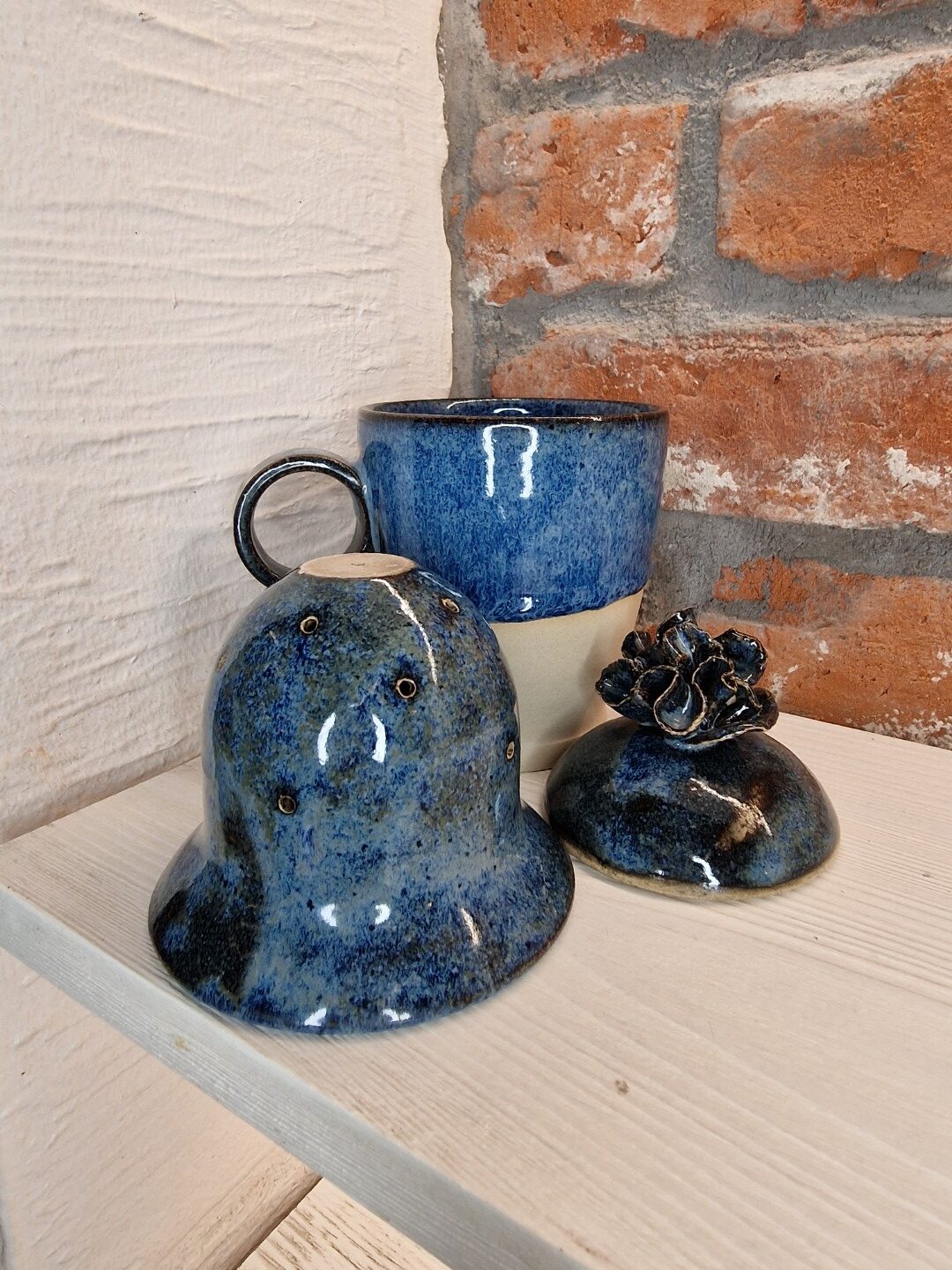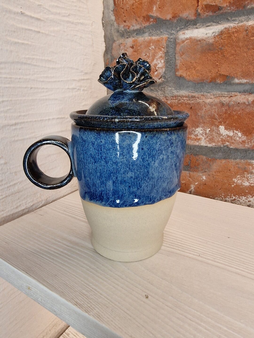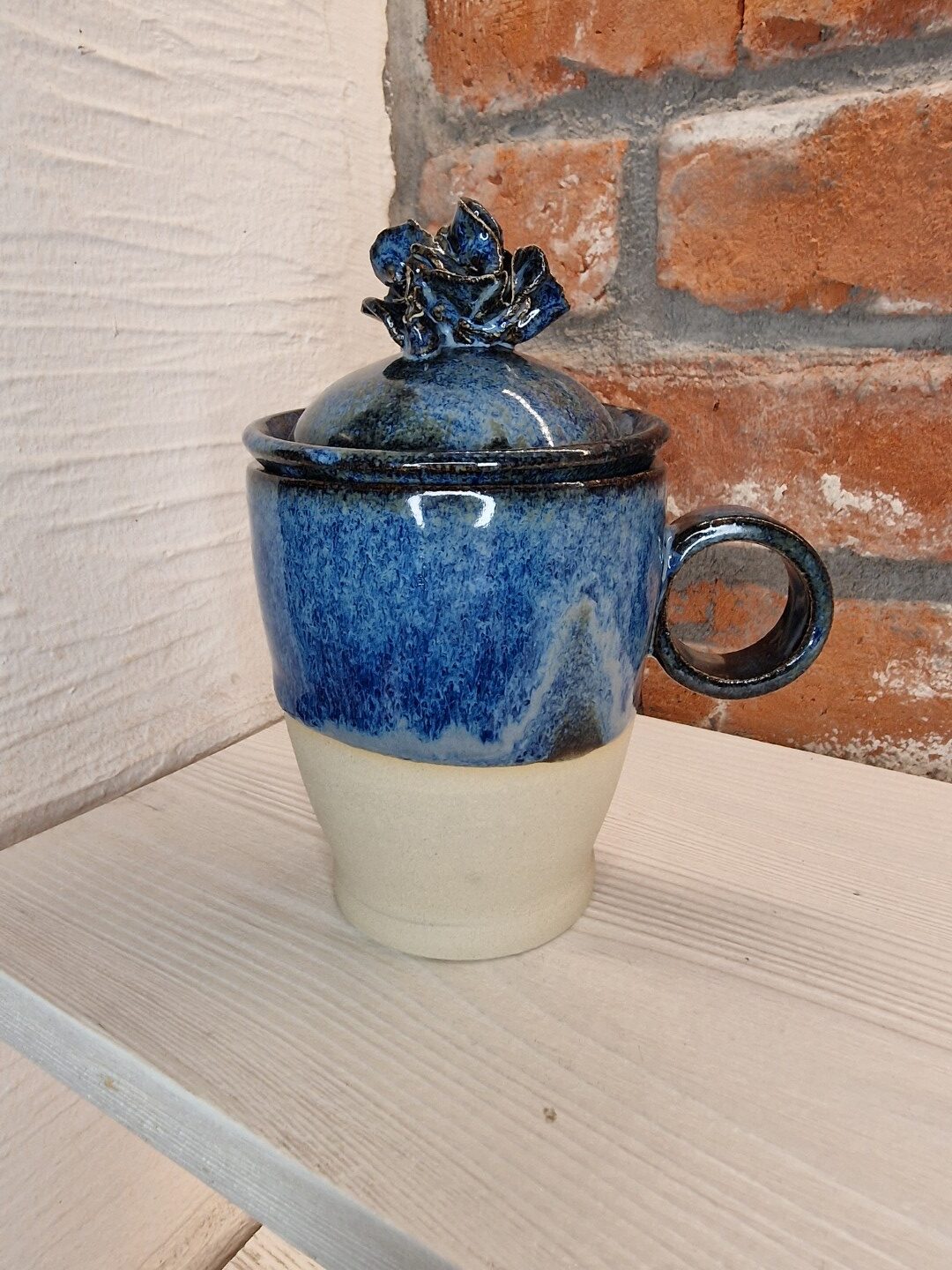 Kubek z zaparzaczem w kolorze niebieskim, w komplecie z siteczkiem do zaparzania herbaty lub ziół oraz przykryweczką.