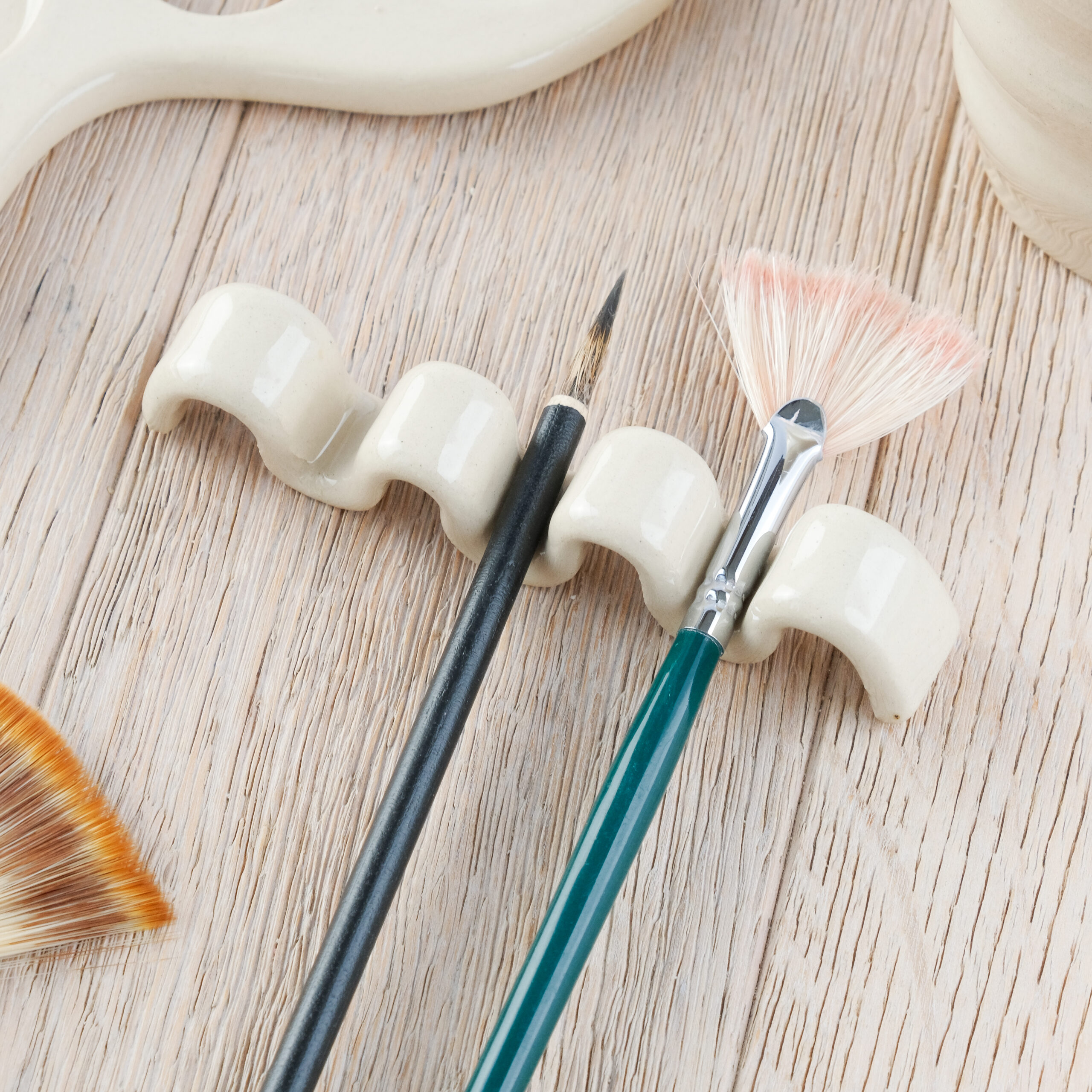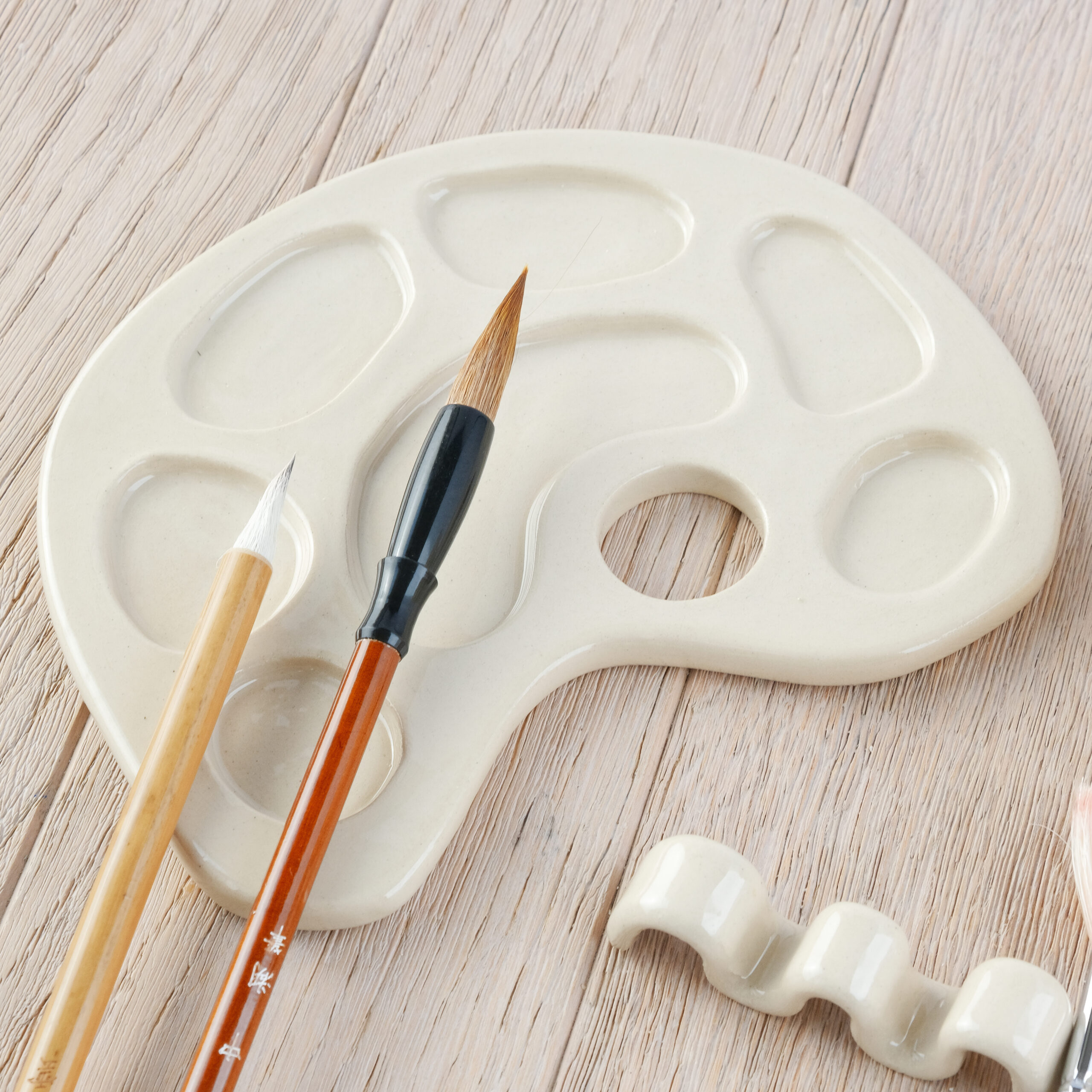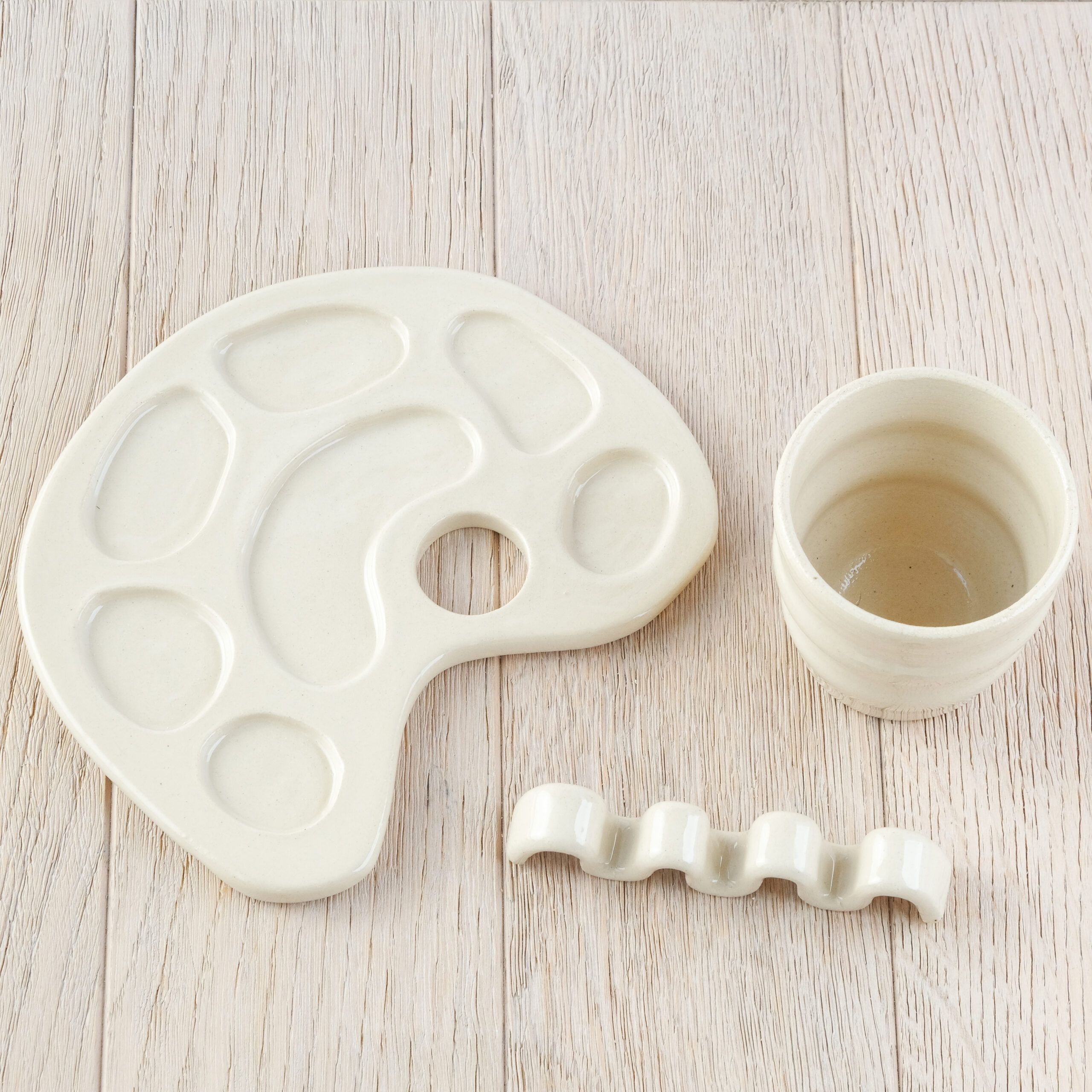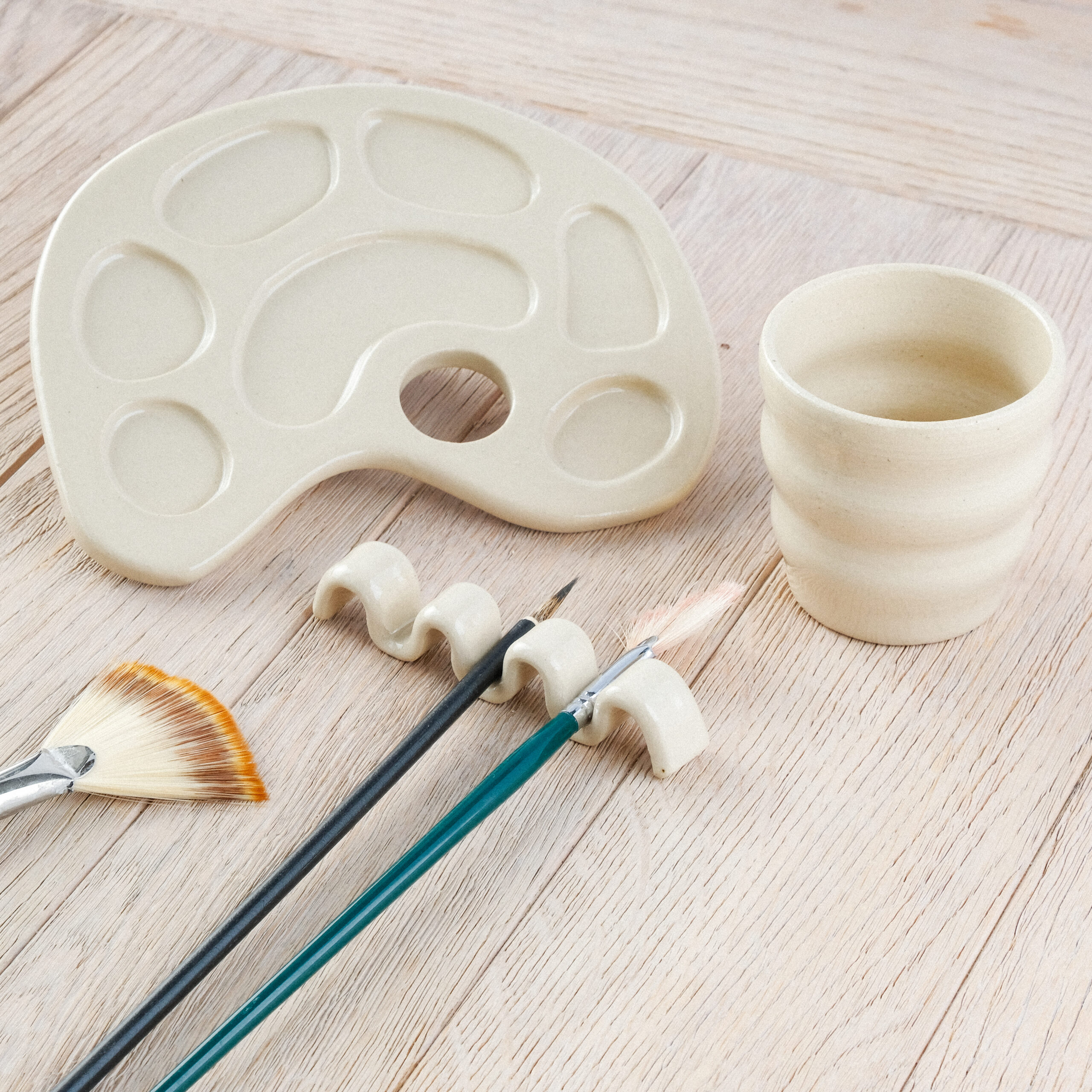 Zestaw do malowania, składający się z palety do mieszania farb, kubka na wodę oraz stojaczka na pędzle.