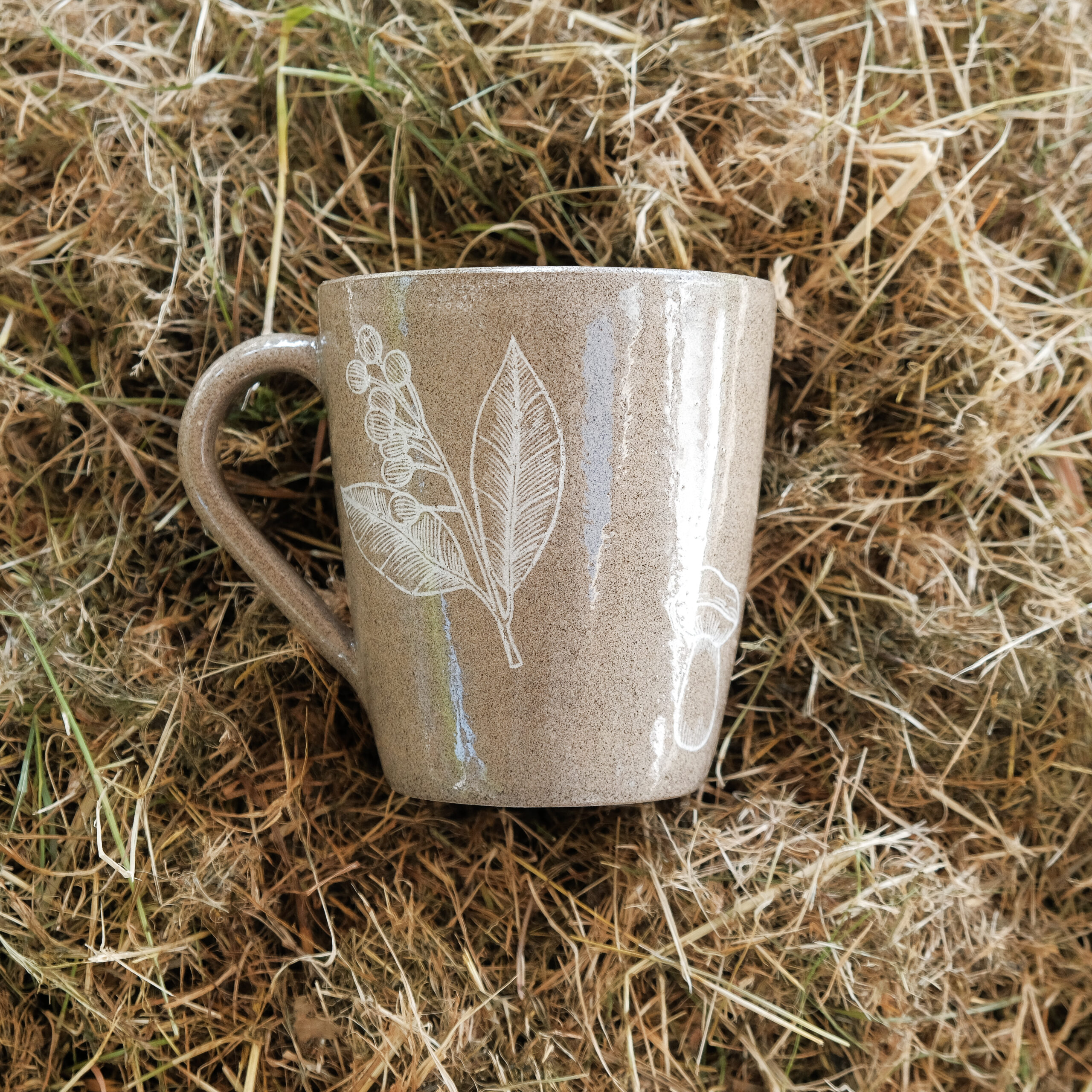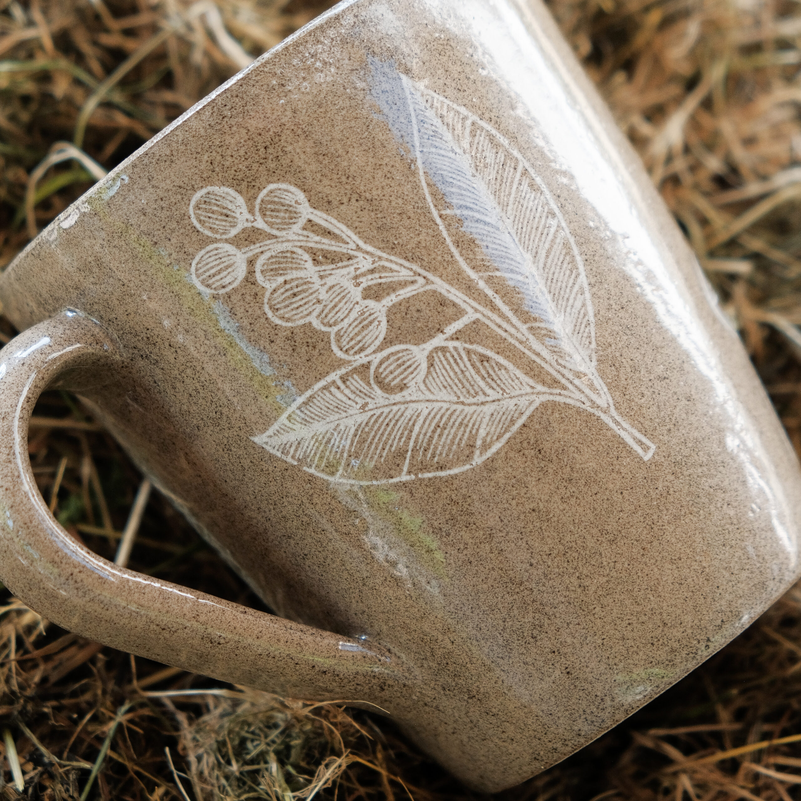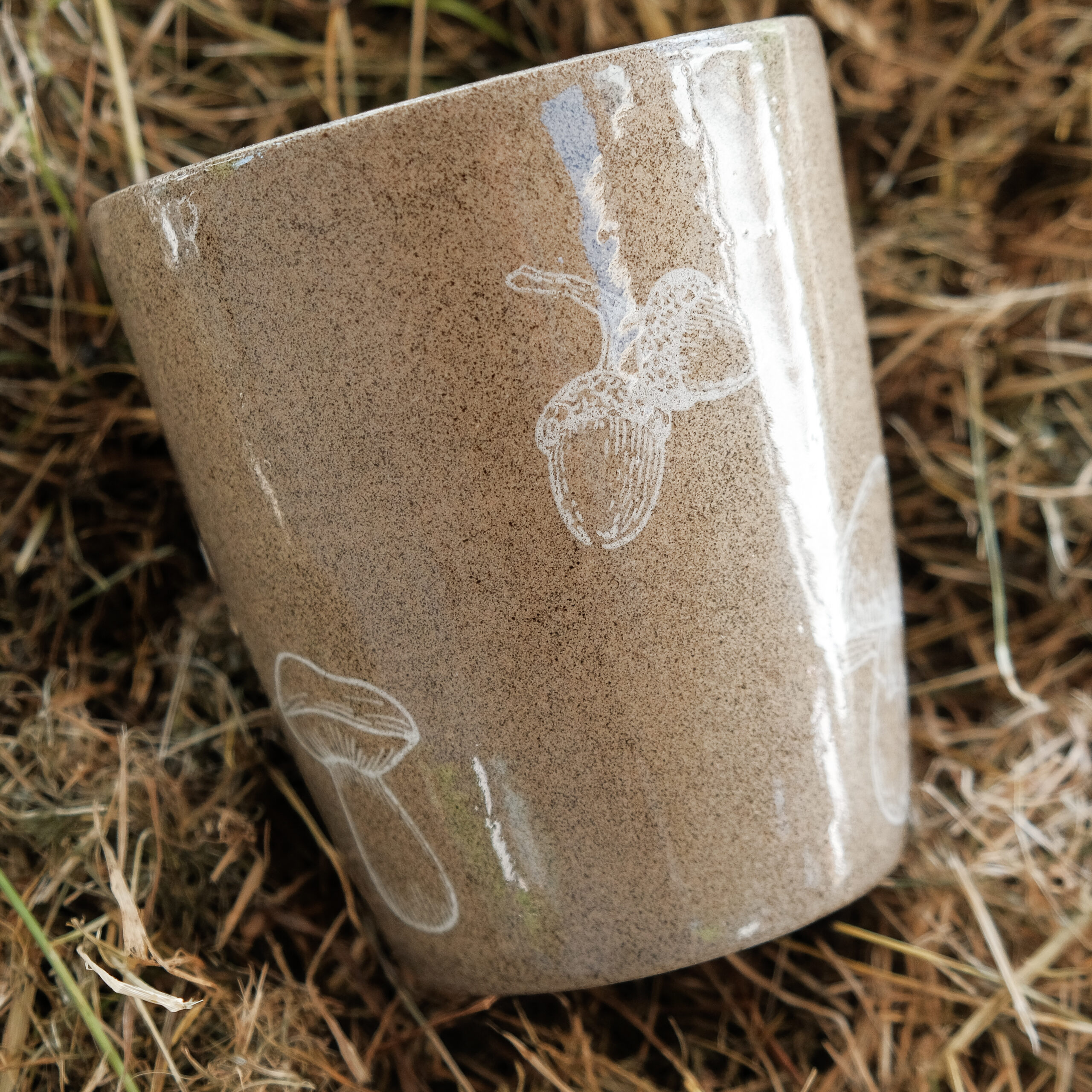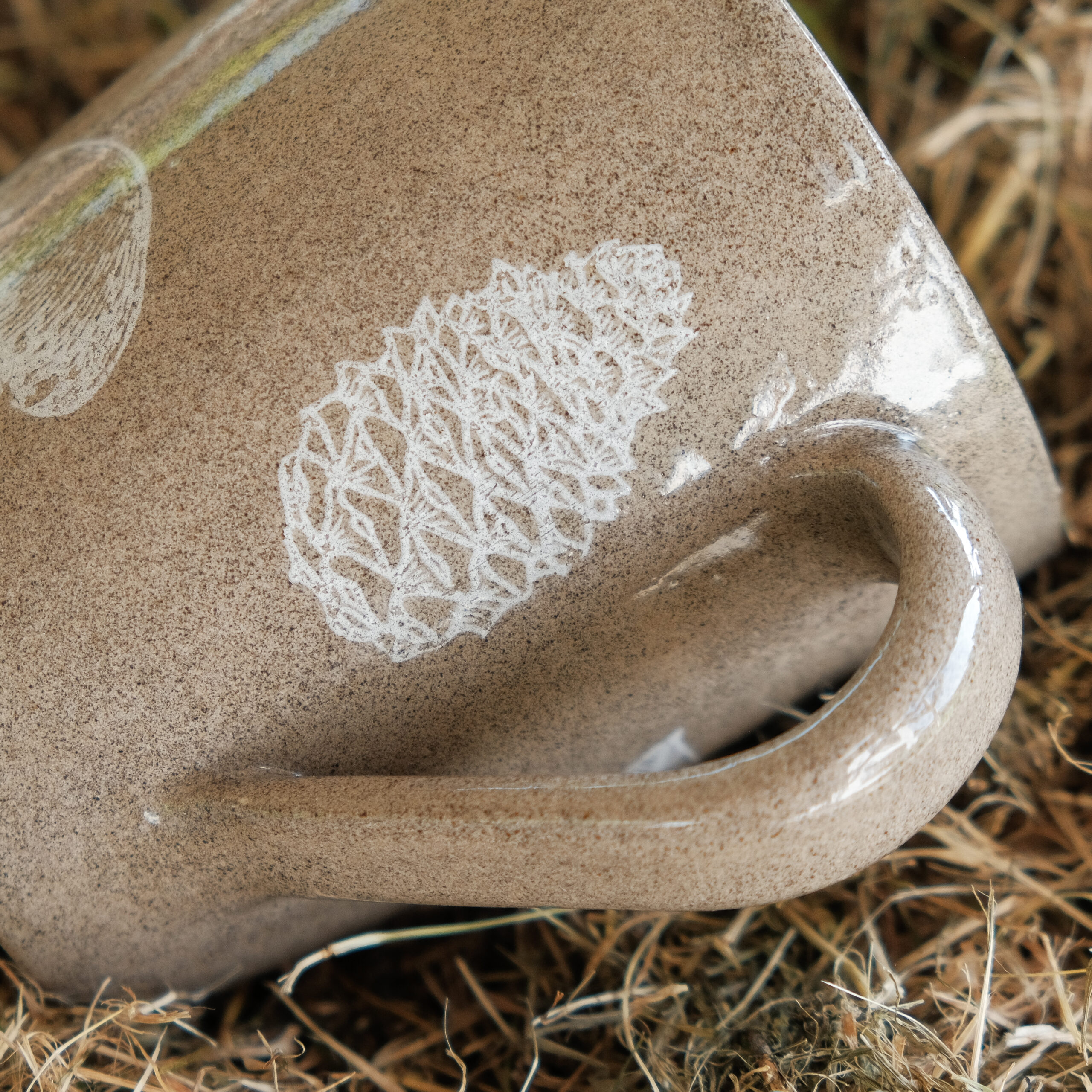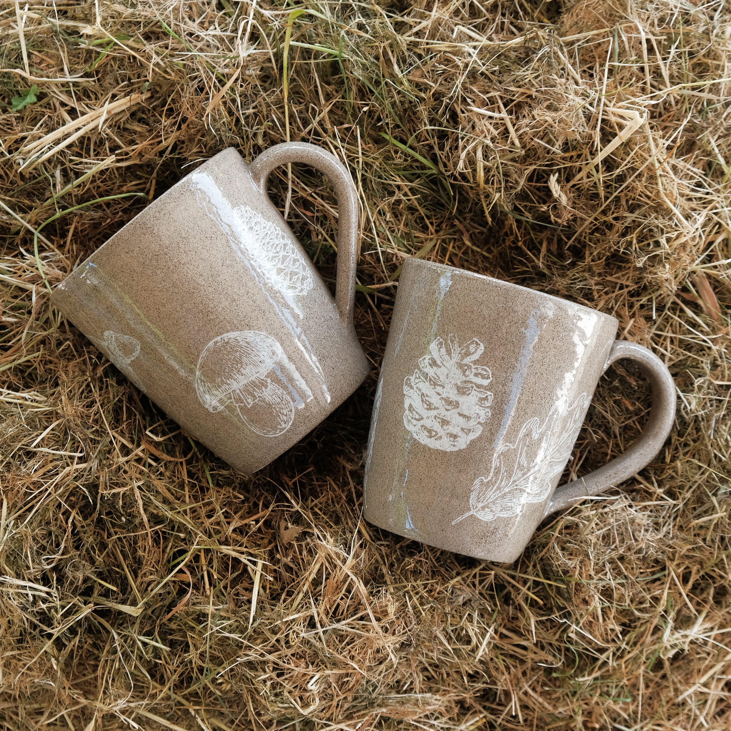 Zestaw dwóch kubków toczonych na kole garncarskim z brązowej lekko nakrapianej gliny z białymi motywami roślinnymi.